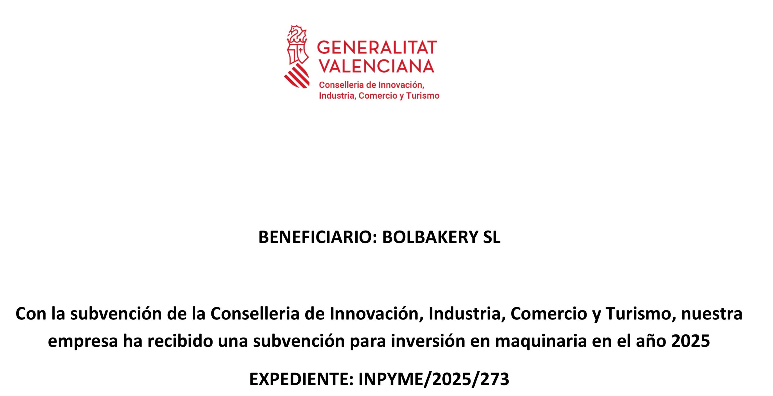La Conselleria de Innovación, Industria, Comercio y Turismo ha subvencionado un proyecto de inversión en maquinaria a nuestra empresa BOLBAKERY SL